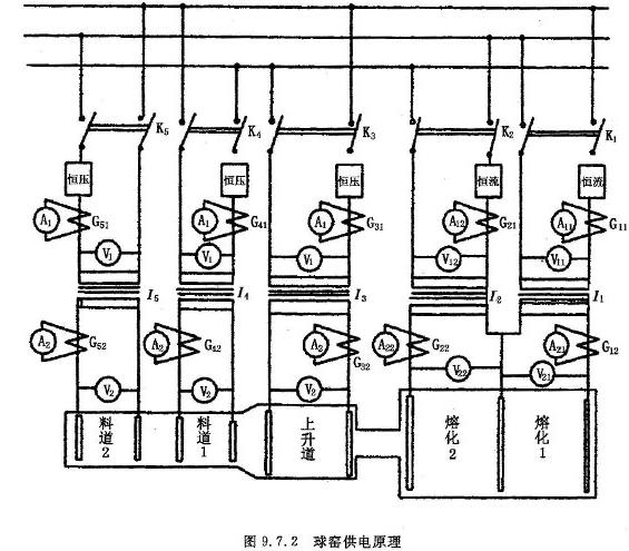 上升道、料道1、料道2几个部位已是熔化好的玻璃液,玻璃液等效电阻不受加料影响,所以采用恒电压控制方案。电熔球窑供电原理见图9.7.2。