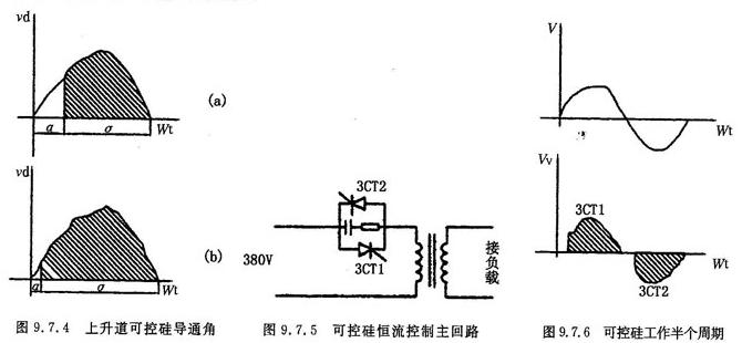 图9.7.5所示是由两只反并联可控硅组成的交流调压电路。从图9.7.6中可以看出,每只可控硅只工作半个周期,它所承受的电流只有负荷电流的一半,在选择可控硅时,一般按1/2负载电流,然后将其换算成额定平均电流即可确定。但是,在实际使用中,如上升道用100A可控硅,按计算可通过220A的负载电流,而实际上在负载电流为140A时,曾连续发生总闸和烧保险的现象。