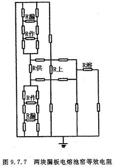 熔窑的每个部分可看成是一个等效电阻,由于高温下的玻璃液是导电的,所以整个电熔窑里的玻璃液是一个大导体,而把各部的电阻连通起来,带电的玻璃液又通过耐火材料和电极冷却水及框架与地连接,这样各部对地具有大小不等的等效电阻(如图9.7.7所示)并流有一定电流形成了对地电压。这个电压如果超过安全电压人触到后会造成触电,如果设备对地电压过高也容易损坏设备,特别是漏板最容易接地,因为漏板除两端头用水冷却外漏板底部也要通水冷却丝根,如果安装不当或漏板变形触到冷却水管就造成漏板接地而引起漏板起弧或者烧漏,所以一定要把对地电压减少到一定的范围内,保障人身和设备的安全,其一:使电熔窑、玻璃液、电极、变压器都要与地绝缘。其二:窑内不能区间电压过高(试验证明区间电压高,对地电压也高)。其三:各区接线要注意相序。通过上述措施该中试窑对地电压见表9.7.12。