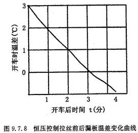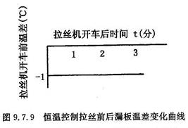池窑拉丝作业正常与否关键在于如何把漏板温度控制好,由于电源电压不稳定,作业部温度波动,冷却水流量,拉丝机开停等因素造成漏板温度波动和拉丝断头。图9.7.8是漏板采用恒压控制,在其它条件都比较稳定的情况下,拉丝机开停对漏板温度影响曲线,从曲线可以看出拉丝机在开车前偏差表是+3°,由于拉丝以后玻璃液流速加快带走的热量多了,使漏板的温度降低了,开车4分钟后偏差表到—1°,漏板温度波动4℃,如果因为某种原因拉丝作业不好,拉丝机开停也就频繁,漏板温度上下波动也就频繁,由于恶性循环使拉丝作业,就更加不稳定,为了稳定漏板温度,采用恒温控制比较理想,通过试验证明用恒温控制漏板不受拉丝机开停的影响。见图9.7.9所示。把P、I、D参数整定好,控制精度1190°C±1°C。