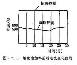 图(9.7.11)为熔化池用恒流控制和调压器控制在加料前后电流变化曲线。不难看出,采用恒流控制比调压器控制稳定性高。恒流控制不受加生料的影响。加速生料熔化提高熔化质量。