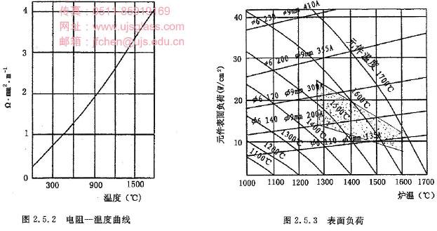 硅钼棒元件的电阻率随着温度的升高而迅速增加(见图2.5.2)。在正常操作情况下,元件电阻一般不随使用时间的长短而变化。因此,新旧元件可以混合使用,根据炉子的结构、气氛和温度正确地选择元件的表面负荷是达到最长使用寿命的关键。图2.5.3示出发热元件辐射在不受阻碍情况下的炉温、元件温度与表面负荷间的关系,阴影部分为常用的表面负荷-温度范围。
