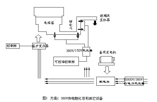 (1)如果采用380V供电,从投资角度上讲,首先要有2000kVA的配电房和2000kVA的电力变压器,其次从电力变压器至窑炉变压器要用很大截面积的电缆。从能耗角度上讲,采用电力变压器必然要增加一次能耗和变压器的铜损;采用大截面的电缆,也必然要增加电能损耗。如图1所示,380V供电熔化池和其它设备。