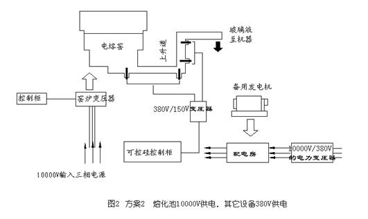(2) 如果采用10000V供电,从投资角度上讲,不需要先将10000V转换成380V,少一台电力变压器,这一部分的配电房也可以省掉了。从能耗角度上讲,减少了电力变压器的电力损耗。如图2所示,熔化池10000V供电,其它设备380V供电。