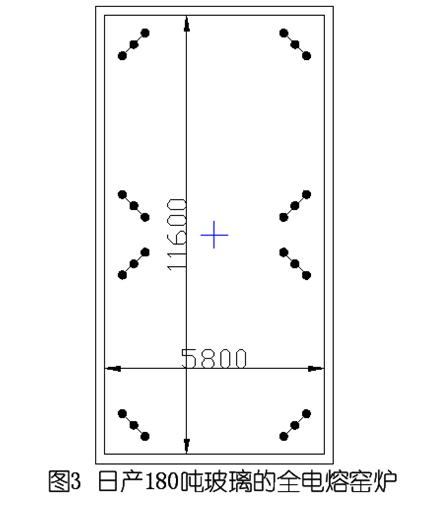 美国一座日产180吨玻璃的全电熔冷顶窑炉于1982年6月建成投产,1985年12月第一次停炉重建。如图3所示,日产180吨玻璃的全电熔窑炉示意图。