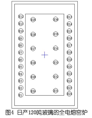 1986年昆明平板玻璃厂引进KTG公司日产120吨玻璃的电熔窑,用于生产平板玻璃。E25-E36为12支底插启动电极,烤窑结束后由顶插E1-E24电极供电。如图4所示,日产120吨玻璃的全电熔窑炉示意图。