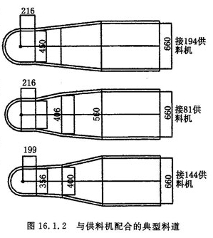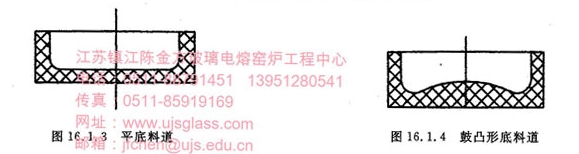为了减小横向及纵向温差,CW型料道的调节段,宽度及深度方向往往采用逐步缩小的结构,使进入供料盆的玻璃液温度逐渐均一;但对于大料滴来说,也有在深度方向逐步加大的形式,这是为了保证玻璃液的静压头和一定的贮备料量。料道的形状多采用平底(见图16.1.3),但是,对于质量要求高的产品(例如屏锥玻璃),料道的形状采用鼓凸形底(见图16.1.4),增加了料道底平面与玻璃液的接触面积,加大了中心玻璃液流的阻力,减小了料道中部的流通断面,因此,使料温较高的中心料流与边部料流的流量接近,减少了因散热而引起的横向温差;同时,因深度小,也相对地减少了深度方向的温差。