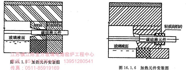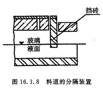 ④用挡砖将料道空间与工作池隔开。碳化硅加热元件的寿命,与料道内气氛密切相关。池窑的高温气体中都含有二氧化硫、水蒸汽等,这些气体的存在影响碳化硅元件的使用寿命。因此,辐射式供料道电加热必须用挡砖将料道空间与工作池完全隔开,也有利于料道温度的稳定。见图16.1.8。