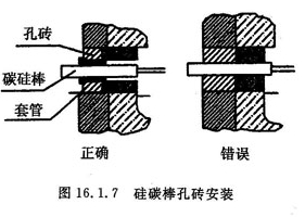| 由于元件砖外侧密封严密和保温效果良好,使元件砖内侧温度提高,因而减少了冷凝现象,有助于延长加热元件的寿命,加热元件与元件砖之间的间隙不仅便于加热元件的更换,而且对防止漏电现象也起到一定的作用。图16.1.7表示硅碳棒孔砖正确安装和错误安装 | ![]() |