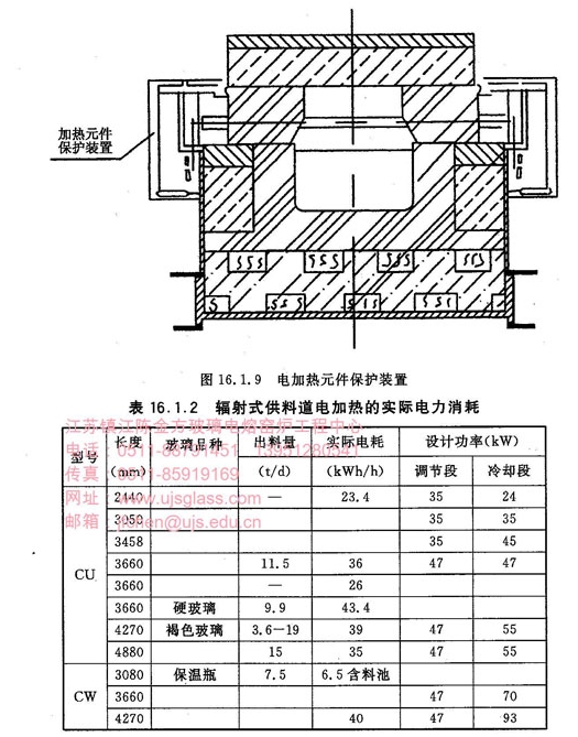 辐射式供料道电加热节约热量50-88%,表16.1.4列出了各种长度的料道的能耗情况。料道的装机功率比正常生产时耗电量大3倍。这是考虑到零出料量时能维持正常温度,及停电后能够较快地恢复生产。实践证明有这样的设计是合理的,如表16.1.5所示,当停电料道降温至900℃后,调节5Kw的最大功率经过3-4个小时就可以恢复正常温度。