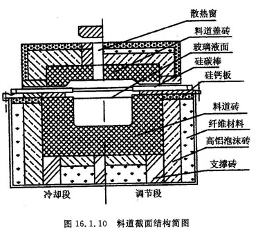 该料道供电设备和温度控制,采用可控硅调压器进行自动控制。辐射式供料道电加热的保温采用泡沫粘土砖和耐火纤维,料道表面温度降到60℃料道上部空间尽量减少不必要的开口,冷却口不设在硅碳棒的正上方,避免玻璃挥发物在这些开口处冷凝,滴到硅碳棒上使其很快损坏。上部空间使用硅线石质耐火材料,避免挥发物侵蚀粘土砖后形成液滴流下,使硅碳棒损坏。