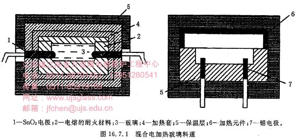 | 图16.7.2除了玻璃中有氧化锡电极加热外,上部空间还有辐射加热元件SiC棒或MoSi2棒。前者水平安装,后者垂直安装。