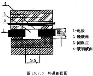 当玻璃液进入料道,为了防止Pb0、B2O3、F-1的挥发、维持玻璃液的均匀性,要象流经一根管子一样流经一个全封闭的通道,并且玻璃液要充满通路的横断面(见图16.6.1)。料道里补充的热量一方面由二氧化锡电极(或钼电极)供电。另一方面由包在料道外面的加热套加热,或在盖板砖上装有金属加热元件,以减少上部热损失。防止在料道壁和玻璃液中形成温度梯度。由于玻璃表面与料道顶部没有空隙,消除了氧化铅的挥发,于是改善了用机械成型或手工挑料生产的玻璃的均匀性。这种电加热供料道配合供料机自动作业时无需搅拌。但是如果人工挑料作业,则需增设搅拌机,以提高玻璃的热均匀性和化学均匀性。挑料口的电极和搅拌机布置见图16.7.2。