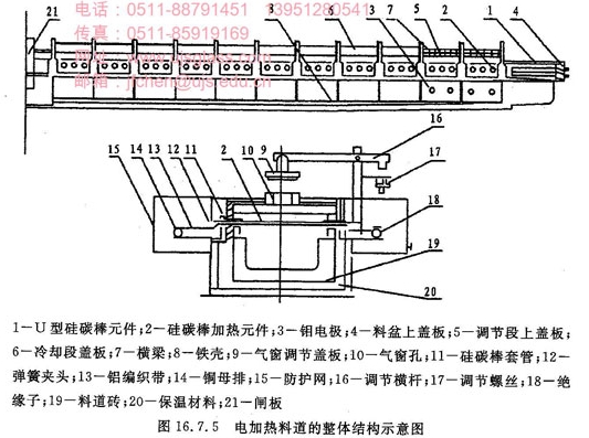 电加热料道的整体结构如图16.7.5所示,其结构主要包括铁壳、耐火材料、保温材料、电热元件、电器接线母排、控制系统、供电系统、钼电极、钢结构、保护装置等组成。1是U型硅碳棒元件、2是硅碳棒加热元件、3是钼电极、4是料盆上盖板、 5是调节段上盖板、6是冷却段盖板、7是横梁、8是铁壳、9是气窗调节盖板、10是气窗孔、11是硅碳棒套管、12是弹簧夹头、13是铝编织带、14是铜母排、15是防护网、 16是调节横杆、17是调节螺丝、18是绝缘子、19是料道砖、20是保温材料、21是闸板。整条料道长7582mm、宽919mm、玻璃液深度150mm与供料机配套,日出料量可达60-100T(料滴温度1250℃)。