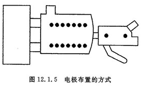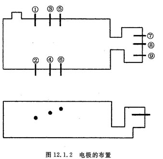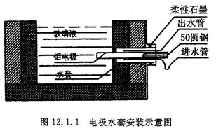 6.电极的选择 选用的φ50×1200mm,比重为10.1的高纯钼棒作电极,经多年的使用,效果是非常好的。钼电极的保护如图12.1.1所示。钼电极在未顶入玻璃料池前应用白泡石塞子将电极孔塞住水套则相应通水。当玻璃液的深度高过电极孔后,将电极逐步顶入玻璃内。待玻璃液达到液面线要求后,从加料口将浮起的塞子掏出。当钼电极顶入玻璃液中,可以通过观察电流的大小来判断钼电极的氧化程度,用恒流控制仪测定的数据来判断。根据电流和电压的变化随时对电极顶入的长度进行调整。如电压升高20%则电极应顶入5mm(因电流是恒流,只能用电压调整)另外电极每使用2个月后,应顶入100mm,即可保证电极的使用效果。使用的钼电极,其化学不纯物如下 C:20—50PPm; Al:1PPm; Si:5PPm; O2:7.9PPm; W:2.1PPm; N1:0.5PPm; Fe:10PPm。玻璃的澄清剂只能用Na2SO4和NaC1,最好是氧化铈,而不能用白砒和锑粉。电极的布置如图12.1.2。