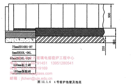 在熔化池和工作池底的放料孔和电极孔处都采用ER1711—RT砖加粘土大砖的结构,未加特殊的保温。