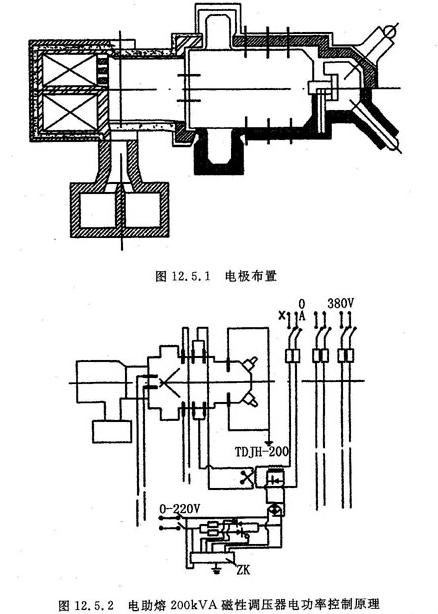 2.电极布置 该池窑装有8支钼电极,为单相供电。在窑坎前后为两支并联,其目的是强化热点,准确控制玻璃液流。加料口处的两对电极是为了加强池窑的熔化能力,去除窑炉的熔化死角,改善玻璃质量。另外,在工作池两侧装有两支接地电极,以避免供料机在操作时产生火花(见图12.5.1)。