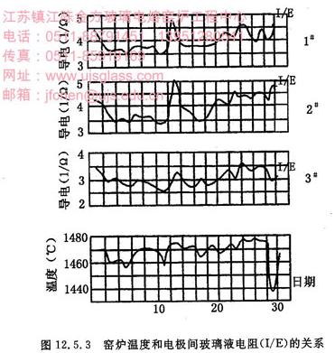 3.供电 其供电方式在窑坎处为一相,其它两对电极在加料口处为交叉单相配电。采用磁性调压器供电(见图12.5.2)。在操作中窑炉温度和电极间玻璃液电阻的变化关系见图12.5.3。
