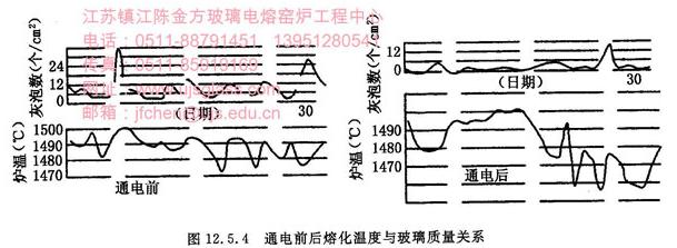 5. 热平衡的测定 该厂1#窑炉(未采用电助熔加热)和2#窑炉(采用电助熔)热平衡测定结果见表12.5.1、表12.5.2。通过这些数字的比较可以很详尽地了解电助熔窑炉的节能状况。 表12.5.1 项目 窑别 2#窑炉 (采用电助熔加热) 1#窑炉 (未采用电助熔) 热 量 收 入 换热回收热 22.13 未测 蒸气带入热 7.68 7.68 电能输入热 2.79 0.2 煤燃烧的热 89.53 99.8 热 量 支 出 形成玻璃液耗热 3.88 2.72 玻璃液带出热 12.07 6.83 表面散热损失 19.93 22.33 孔口辐射溢流损失 12.94 0.13 冷却水带出热 1.11 0.93 灰渣物理热损失 0.54 0.6 其它热损失 2.53 4.42 机械不完全燃烧热损失 7.14 7.68 水汽带走物理热 11.12 10.24 化学不完全燃烧热损失 0.78 1.18 排烟热损失 27.96 42.94 表12.5.2 收入热量 有效热利用率 废气带走的和各种热损失 热利用率 1#窑炉 100% 14.94 85.06 未测 2#窑炉 100% 21.92 78.08 45.37 6. 使用结果 电助熔加热技术在该厂一年多的使用结果:(1)在熔化池温度波动较大情况下,电助熔能改善和稳定玻璃质量。图12.5.9为该厂通电前后池窑熔化温度与玻璃质量之间的关系。(2)窑炉熔化率提高了20%,满足了两台六组单滴行列式制瓶机生产各种规格产品的要求。(3)池窑增加出料量部分的玻璃液单耗为0.63kWh/kg。(4)每天增加出料量6~8吨。(5)由于采用了电助熔加热,每年可少向大气排放约960万Nm3废气,减少了环境污染,也减轻了工人的劳动强度。