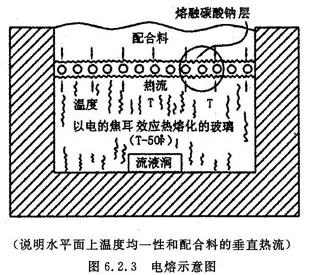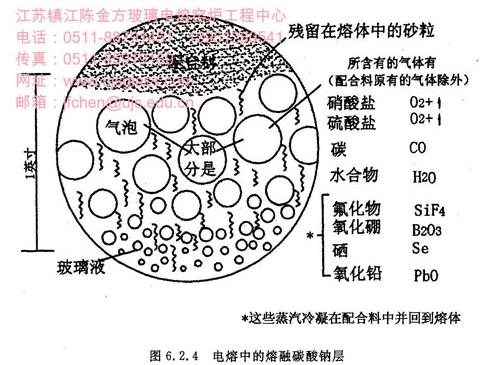 采用全电熔时,热量是在配合料层下面放出。各配合料组份产生的蒸气通过配合料向上逸,但会凝聚在冷的配合料中,因此通过流液洞的玻璃能保持成分稳定,与投入熔窑的配合料相一致,能够精确地控制玻璃的成分。图6.2.4说明了这一关系,此图是一座全电熔窑的截面图,玻璃液的流动是垂直向下的,热流是垂直向上的,电熔窑中的全部玻璃基本上都经历相同的热历史,而采用常规燃料加热熔化的玻璃则并非如此。玻璃液和配合料之间的界面叫熔融碳酸钠层,具有颇重要的意义。图6.2.5是该层的放大垂直截面。在该层中,液态玻璃形式过程已经结束,澄清过程也已大体完成,玻璃的颜色已通过有关着色组份的氧化还原状态而确立。四周液态基体中的剩余砂粒已在熔融碳酸钠层下面的玻璃液中最后溶解完毕。
