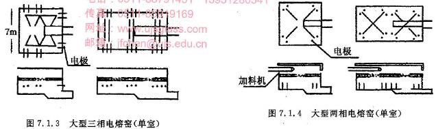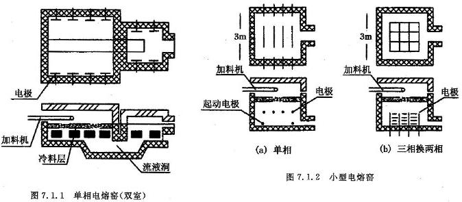 虽然电熔窑在不断的变革发展,仍可在至今流行的设计中清楚地看到它们的雏型,归结到两家公司早期的熔化炉设计上,其典型例子示于图7.1.2中。