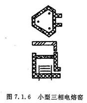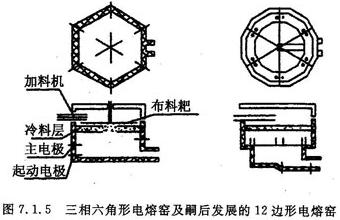图7.1.3图7.1.4是日产超过100T/d的钠—钙玻璃的电熔窑。电熔窑可用两相电源运行,图中还画出了电极的布置。配合料可以由一台播撒型加料机加入,产生真正的垂直熔化,也可以在墙的一端用一台推进型加料机提供部分的水平熔化。通常对这些电熔窑的电极电路附加了恒电流或恒功率控制设备。使用垂直电极的熔化池,可用两相也可用三相电源,电极的连接方式不尽一样,以获得等功率的分布。图7.1.4中的这种特殊的电极按排,在玻璃电阻率高时很有用,因为此时比侧墙型电极系统获得更低的电压。这些电熔窑的电源,为使负载分担给三相,可以增加一台功率平衡设备,不过现今电能的不断增长,供电部门允许工作的两相电源上按装适当的负载而不考虑对第三相的平衡。 图7.1.5是另一类电熔窑外形的示意图及其电极布置。数年前人们就认识到了这种六角形电熔窑的优越性:①比之矩形炉,六角形的炉墙面积减少10%,②可使用完全平衡的三相电源。这就意味着热损失的减少和耐火材料费用的降低。配合料的加入通过螺旋加料机或振动加料机加到炉内装有转轴的平板上,由于转轴的旋转,使平板上的料播撒到整个表面上。现今已建造按装了许多这类电熔窑,并正熔制着许多种类的玻璃,它们有钠—钙玻璃,有色玻璃、氟化物玻璃、乳白玻璃、中性玻璃及硼硅酸盐玻璃。最近按装的一台是熔制具有抗热性能的炊具玻璃,图7.1.5中的右侧即是该种电熔窑的基本设计示意图。同时,由于结构改进,热损失减少,使这些电熔窑的功率消耗非常有效。不过,这些电熔窑的尺寸受到限制,因为电熔窑尺寸大,所需电压高。 使用氧化锡电极熔制铅晶质玻璃的电熔窑,由于氧化锡的电流负载低,与容量相当的用钼电极熔制钠—钙玻璃的电熔窑相比,需要有多得多的电极数量。例如一座20吨的钠—钙玻璃电熔窑需要6支直径为5cm的钼电极,同样为20吨的一座铅晶质玻璃电熔窑将需要按置60支的氧化锡电极。在这类电熔窑中,把配合料播撒到整个玻璃液面上维持完全的冷顶是最为重要的,只有此时才能获得冷顶熔制的全部优点。 图7.1.6是小型的三相电熔窑。三角形的是一种特意设计、造价便宜的电熔窑,适合于在不发达地区建造使用。这种电熔窑只有电极砖和流液洞砖是AZS的,用手工加料,由一台简单的三相调压器进行控制。工作池与熔化池由流液洞分开,手工成型。