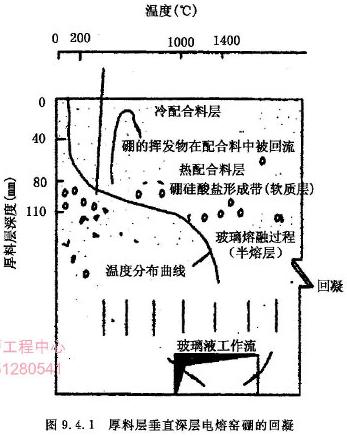 ⑵ 冷炉顶可以回收硼的挥发物。厚料层的料层厚度一般在100~200mm,表面温度在200℃以下,因此又可称“冷炉顶”。从一幅典型的熔制高硼硅玻璃的冷炉顶图9.4.1中,可以看到配合料表面0~40mm这一层,温度稳定在120℃,仅水份在蒸发,可称为冷配合料层。深度在40~80mm,温度从120℃提高到250℃,硼酸开始分解,称为热配合料层,深度在80~110mm的温度变化最剧烈,从250℃上升到1000℃,完成了硼硅酸盐的反应过程,称为硼硅酸盐反应带,也可称轻质层。再下一层则是含有大量气泡和带有未熔化好砂粒的熔融玻璃,称为玻璃的熔融过程,也可称半熔层。在这层下面就是玻璃的澄清和均化区域。硼硅酸盐配合料从表面的料层到轻质层,经过温度从120~1000℃的热过程,必然会发生硼酸和硼砂在脱水期中的硼酐挥发,挥发物由下向上逸出时,遇到冷的表面配合料层凝结起来,便产生硼的回凝现象,而在反应过程中所产生的CO2和NOx气体很容易穿过疏松的配合料层逸出。因此,硼的挥发物可以在这里几乎被回收。应用这个原理,同样可以回收其它含有氟、铅和硒玻璃的挥发性物质。由此也很容易解释薄料层全电熔熔制工艺中硼的挥发率较高(10%左右)的原因。