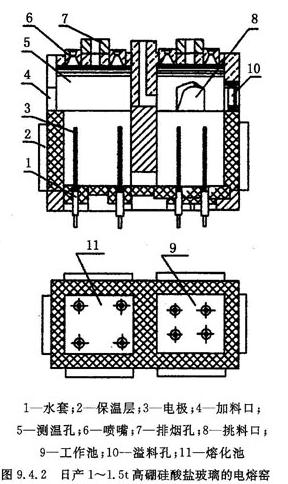 (1)小型电熔窑有较好的经济性,以日产2.0吨的高硼硅玻璃球窑为例,从燃料和硼挥发两顶进行比较如表9.4.3