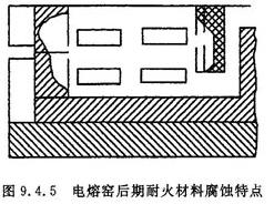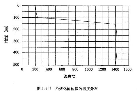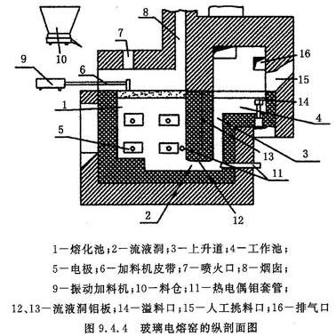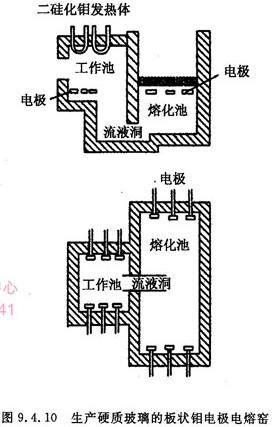 熔制硬质玻璃的电熔窑,其窑结构如图9.4.10所示,电熔窑采用冷炉顶,使用板状钼电极。在电极附近温度最高,底部约降低150℃。电极的上部,直到冷顶处温度大幅度降低。