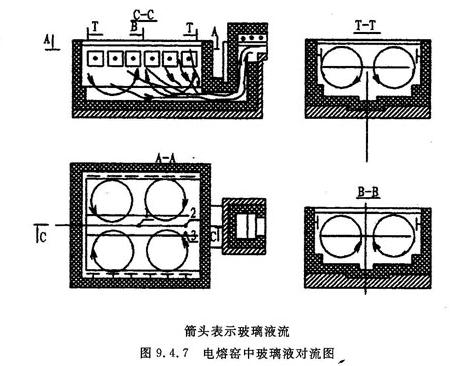 ⑶澄清和均化在垂直深层方向中进行。在垂直深层电熔窑中,在工作流的作用下,玻璃液从半熔层垂直向下运动,流向流液洞(见图9.4.1),而玻璃中的气泡依靠斯托克斯的原理由下向上运动,向液面排出,完成了澄清和均化过程。这个过程与水平式火焰池窑熔制有较大的区别,它好象在垂直管道中进行,没有与空气相接触的自由表面,因此不可能产生硼从玻璃结合态中挥发的问题。