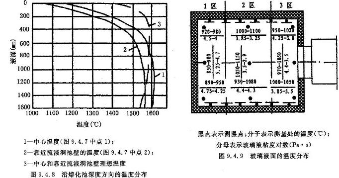 表皮层的形成可在粉料与碎玻璃熔体的界面上。产生这种情况的原因是由于加入的配合料湿度较高、熔体的边界层过冷、结合水从硼酸和碳酸钾中除去、以及加入了湿的大颗粒碎玻璃的结果。这种碎玻璃不能与配合料迅速起反应,在软化时形成表皮壳。因此必须重视配合料的制备。并且使熔制的最高温度区接近于玻璃液表面(见图9.4.8中的曲线3),流液洞池壁保温对于区域3(图9.4.9)的温度均衡,并使其接近区域2的温度会产生有益的影响。这可以使玻璃液工作流中灰泡和气泡数量减少。