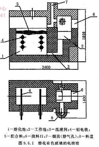 如图9.6.1是熔化有色玻璃的棒状电极电熔窑的结构。电熔窑的棒电极是沿着熔化池的池壁分布的(见图9.6.1)。为了使电流传入熔体,棒电极的直径和它们之间的距离保证了电极侧面充分有效的利用。