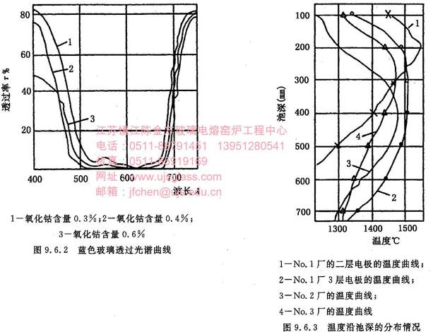 在NO1厂两层电极电熔窑的熔化池沿池深玻璃液的温度分布(见图9.6.3曲线1),温度梯度的最大值和最小值为260℃,靠近底层的温度降至1150℃,使玻璃液成型性能变坏。当电极增至3组时则改变了温度曲线的走向。观察到曲线均匀地向炉底下降,由于没有按电极排列来调整功率比影响了电熔窑日产量的提高。
