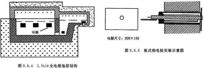 电熔窑熔化池深600mm,池宽700mm,池长1500mm,熔化池面积1.12m2,玻璃液深540mm,熔化池体积0.605 m3,日平均出料量1500kg,面积熔化率1.43t/m2d,体积熔化率2.48t/m2d。熔化池钼电极的布置采用平板附壁式,窑内能量分布均匀,玻璃液熔化质量好。电极板通过钼棒引出池壁,钼棒采用干式双套管法保护,省去了复杂的软化水循环冷却系统,降低了熔窑的热损失。实际应用过程中未出现冷端严重氧化的情况。板式钼电极的安装如图9.6.5所示。